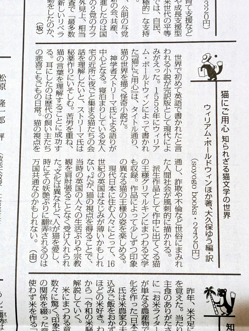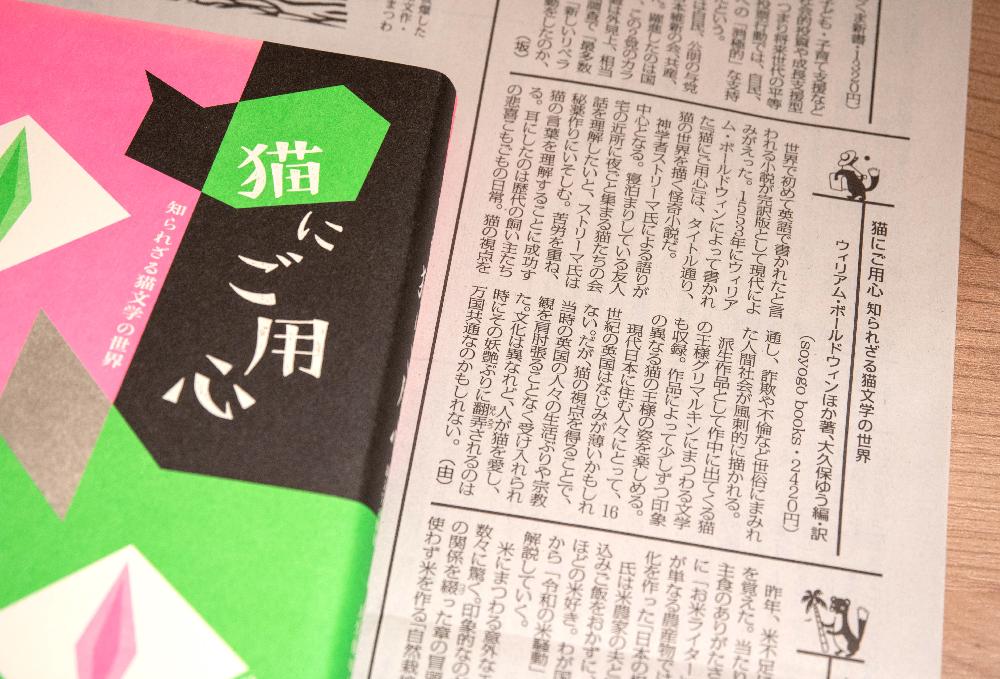 このたび、弊社より刊行いたしました『猫にご用心 知られざる猫文学の世界』が、2025年8月9日付朝刊の毎日新聞の書評欄「今週の本棚」にてご紹介いただきました。