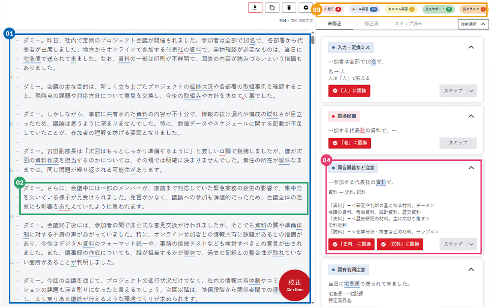 新聞社の膨大な校正履歴を学習したAIを搭載。ルール辞書と組み合わせることで、誤りや注意点を抽出し、文章の確認作業を効率的にサポートします。